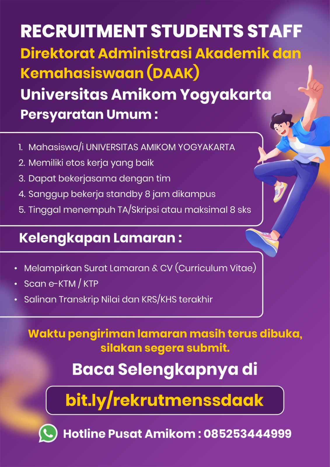 Dalam rangka memaksimalkan pelayanan Akademik agar lebih baik dan memberi pengalaman kepada Mahasiswa dalam menghadapi dunia kerja, maka bagian DAAK UNIVERSITAS AMIKOM YOGYAKARTA membuka kesempatan bagi mahasiswa AMIKOM untuk menjadi student staff Tahun Ajaran Genap 2025/2026 dengan kualifikasi sebagai berikut: